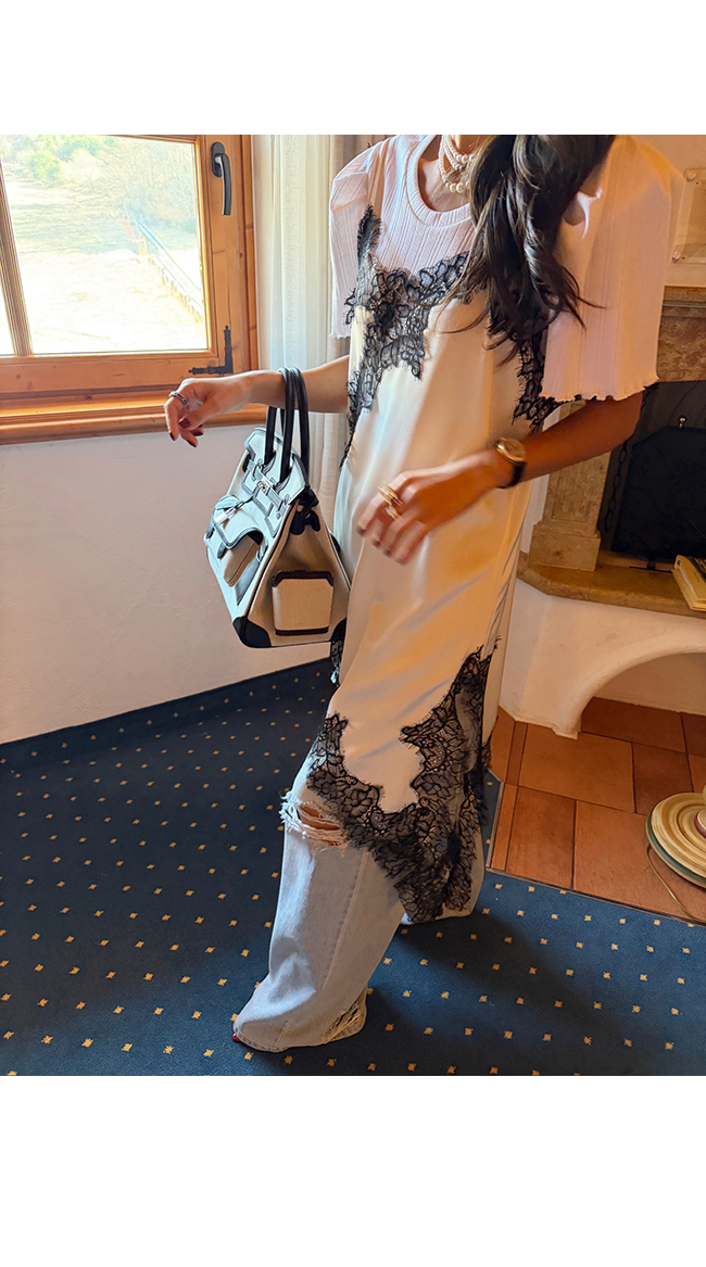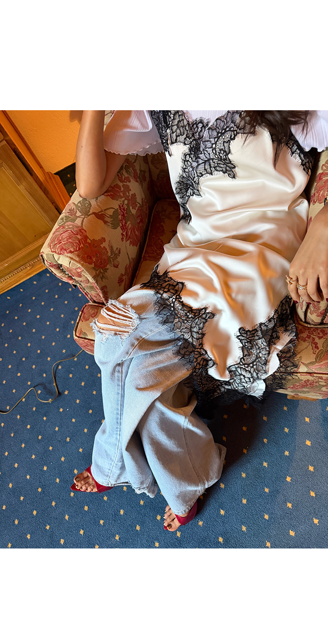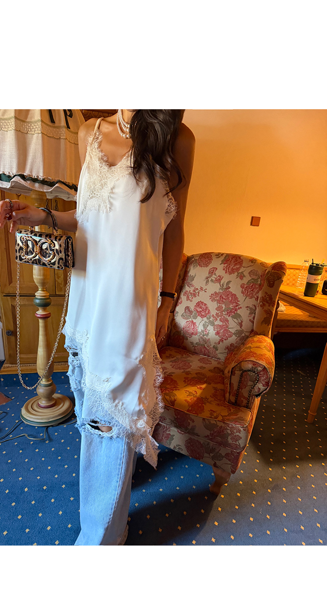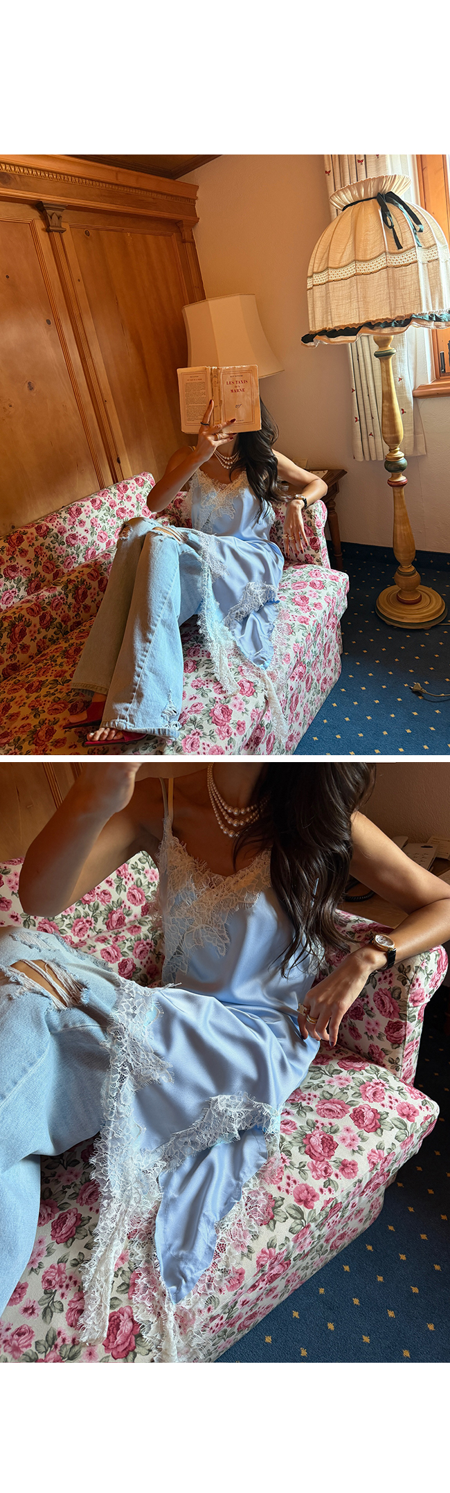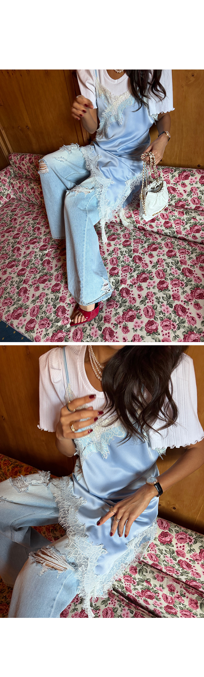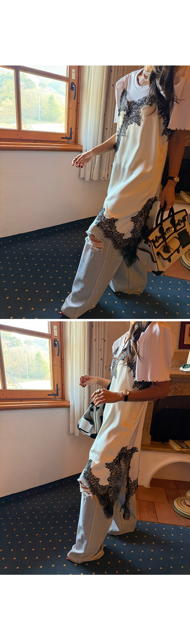 밑단은 언발란스하게 떨어지는 레이스 트리밍으로 마무리되어
