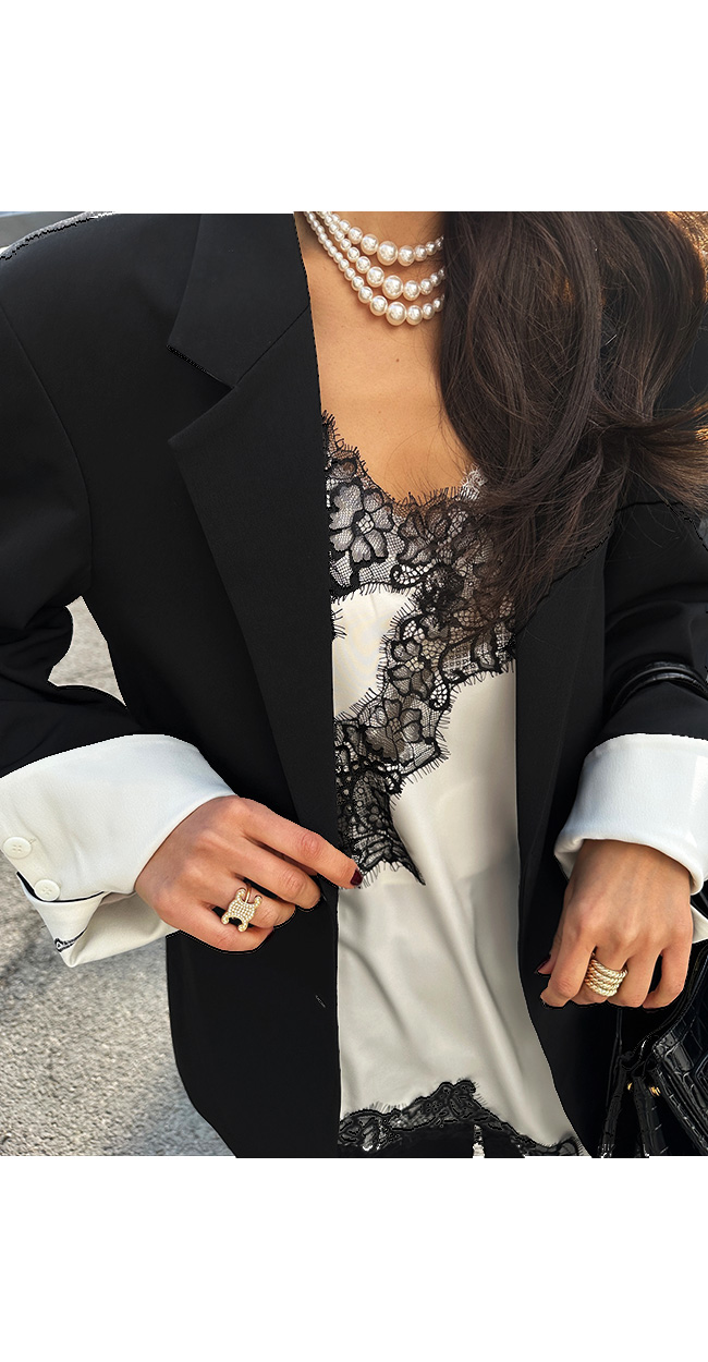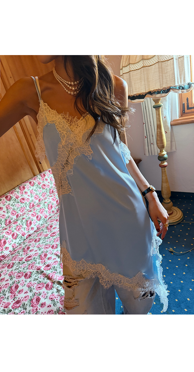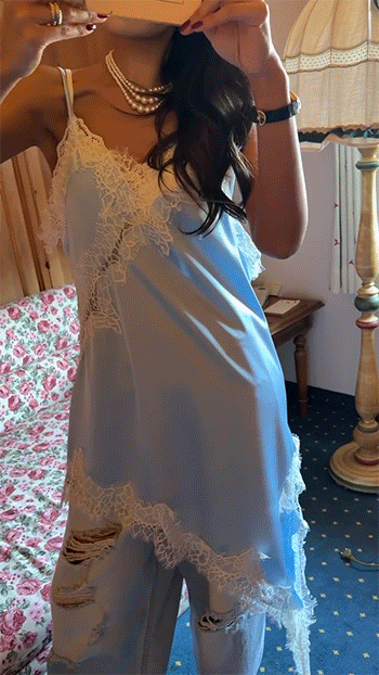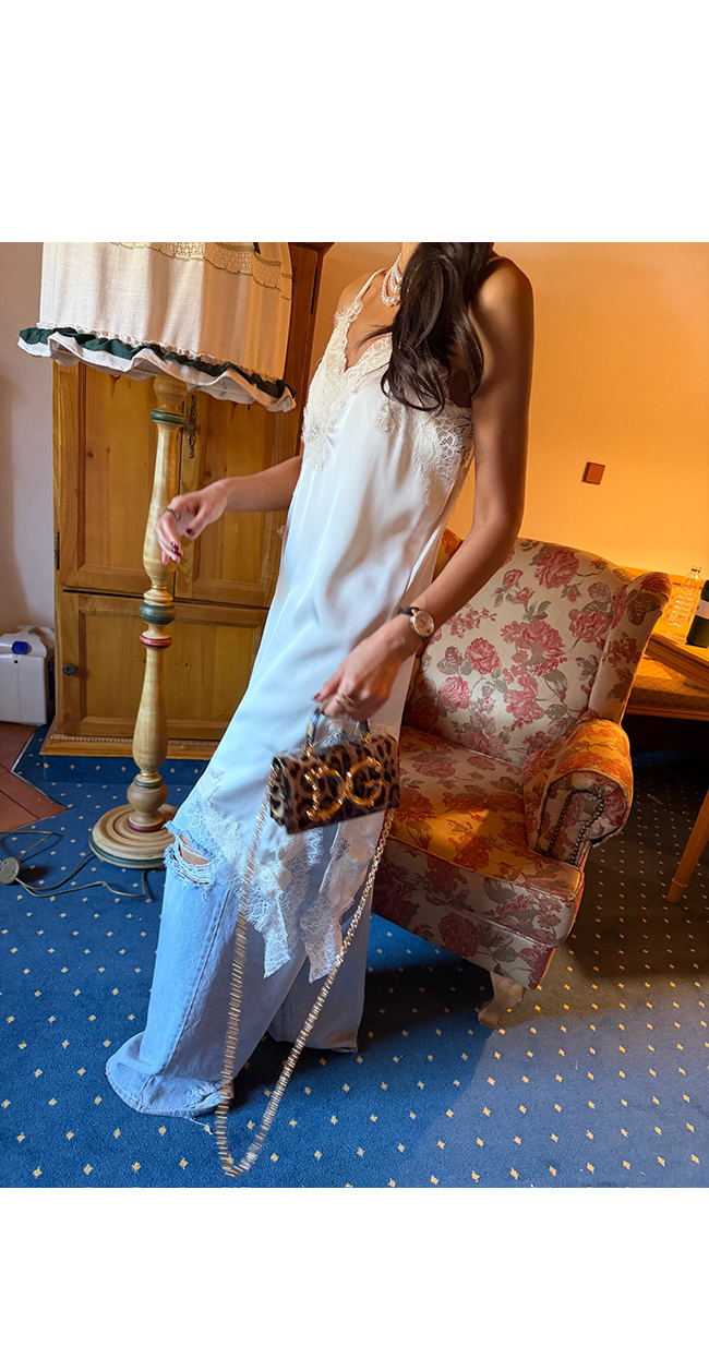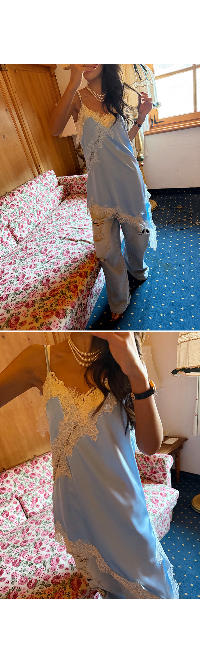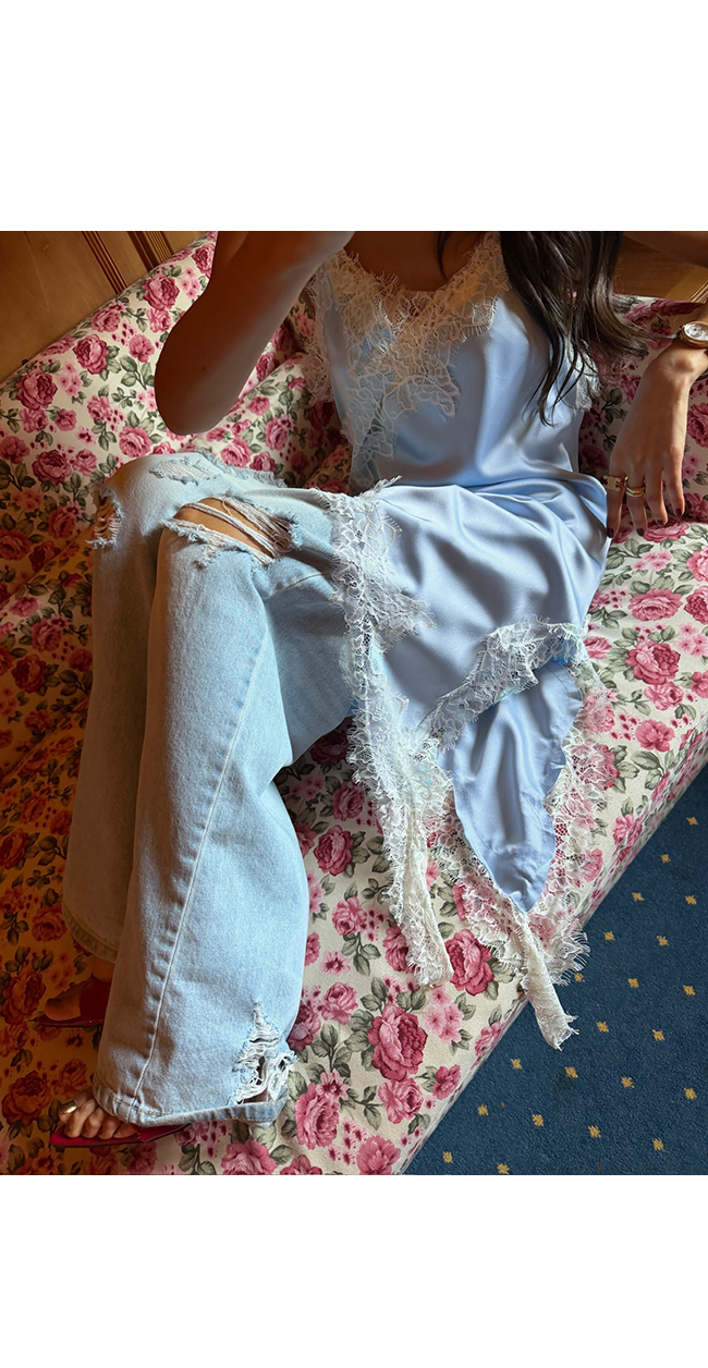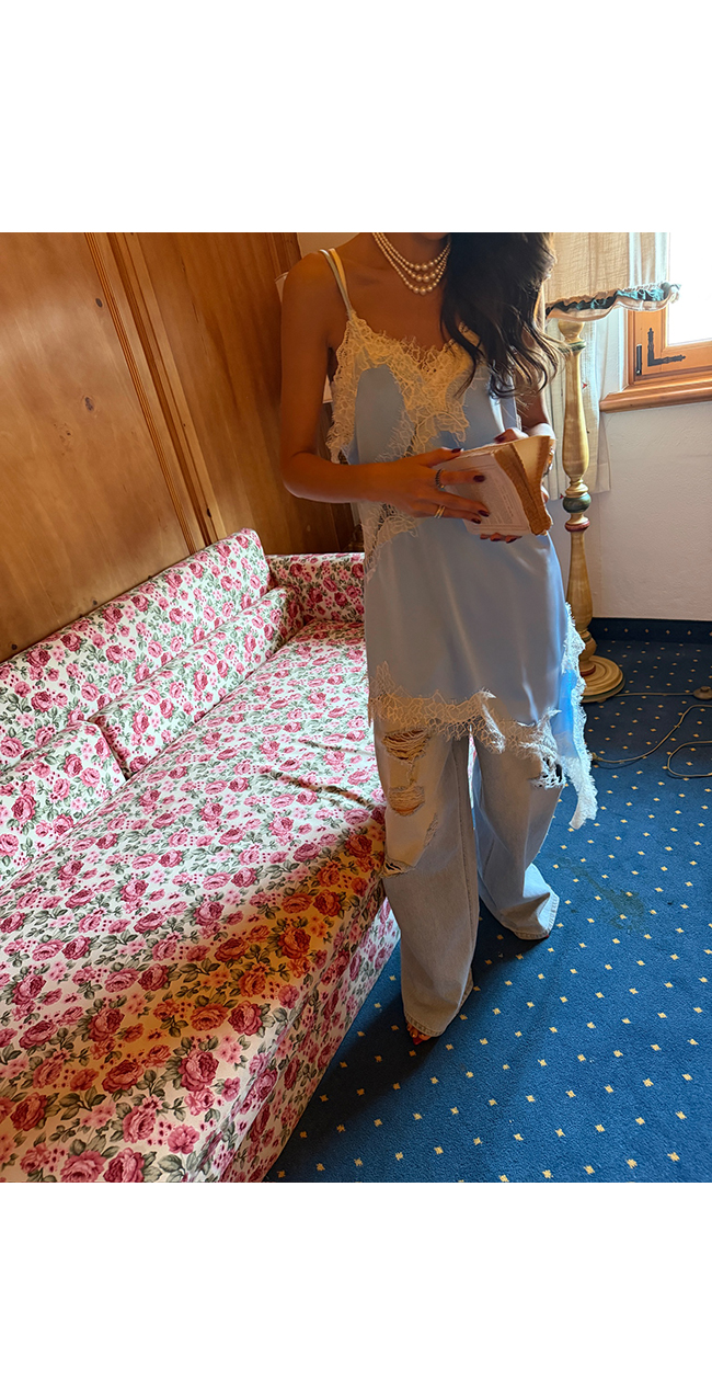 밑단은 언발란스하게 떨어지는 레이스 트리밍으로 마무리되어