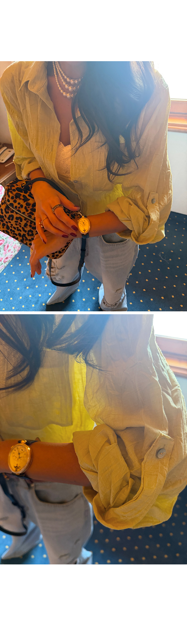 소매는 롤업 후 버튼으로 고정 가능한 디자인으로
