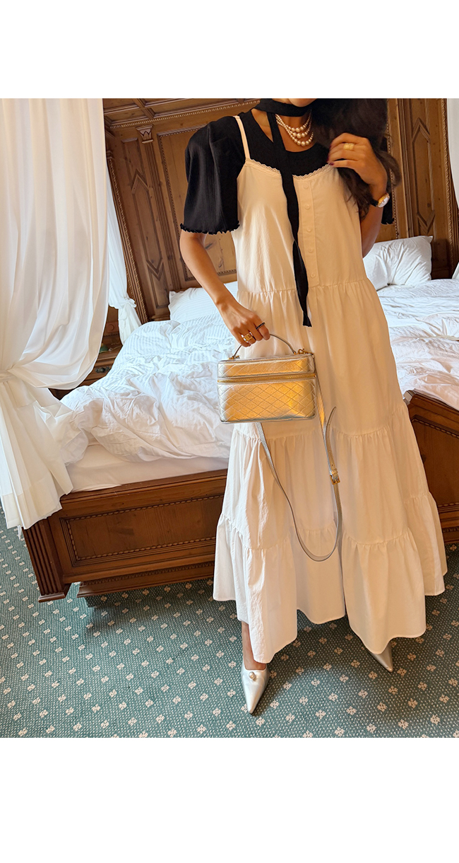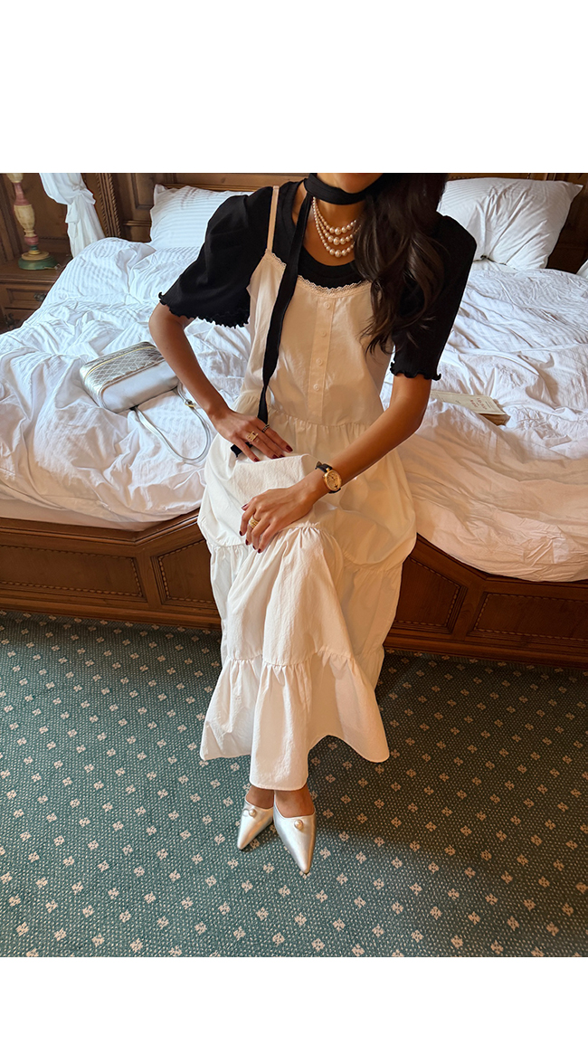 넥라인에는 길게 떨어지는 타이 디테일을 더해