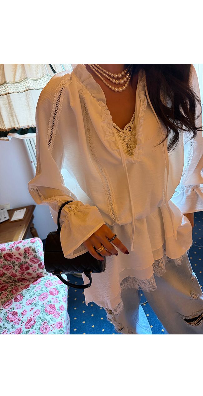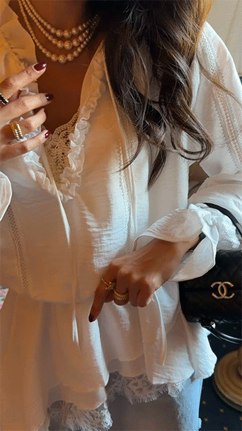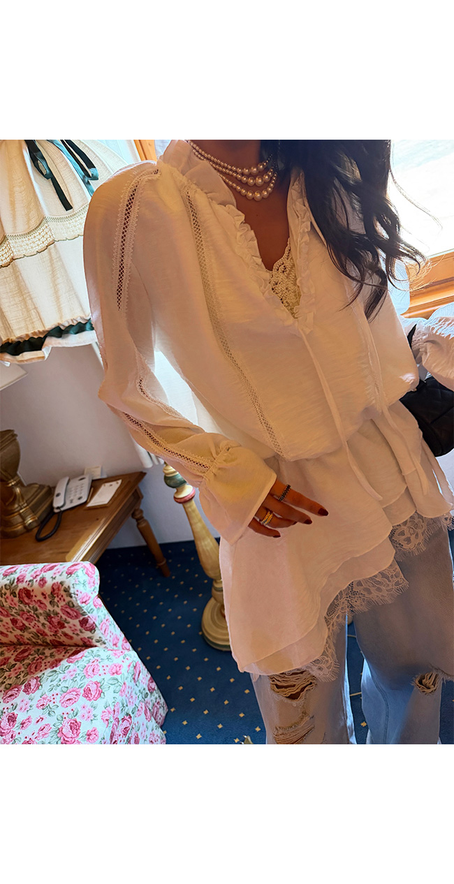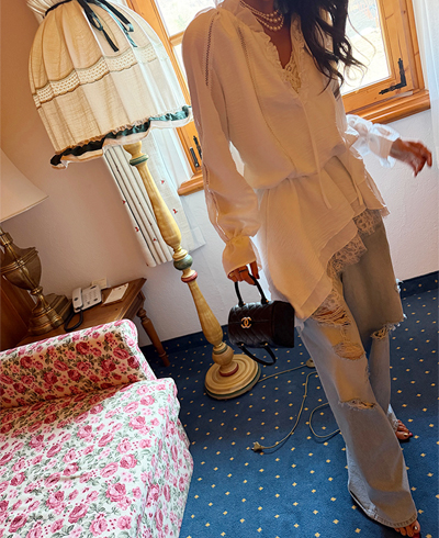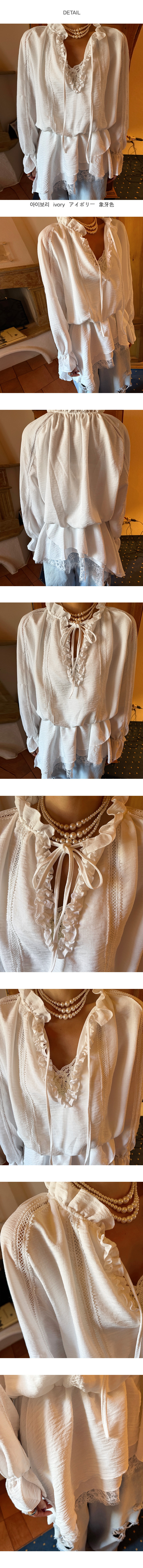 숄더 라인과 소매를 따라 더해진 레이스 라인 디테일이