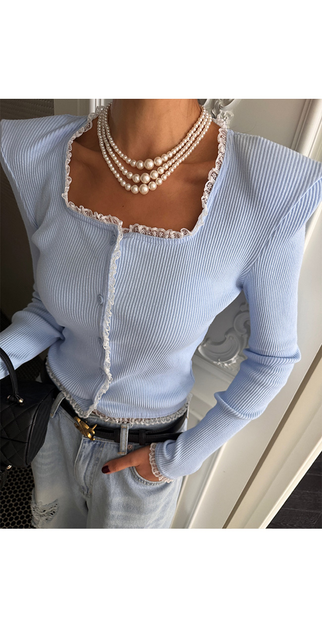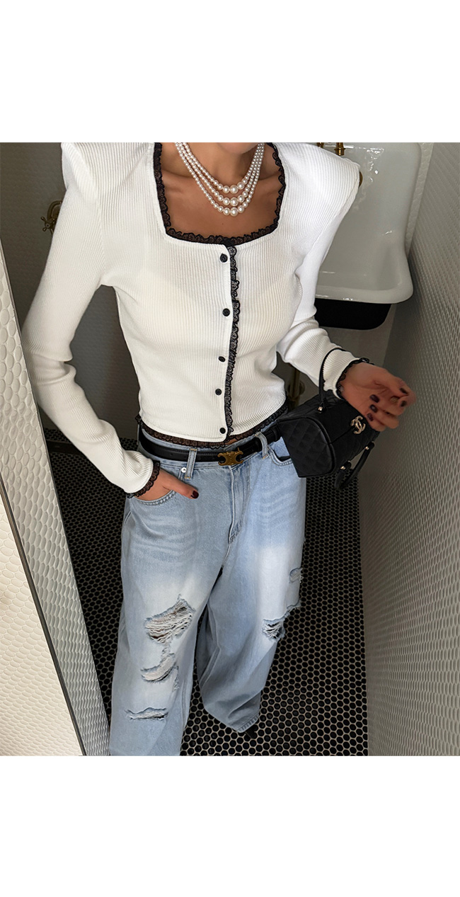 스퀘어 넥라인에 레이스 배색 디테일을 더해