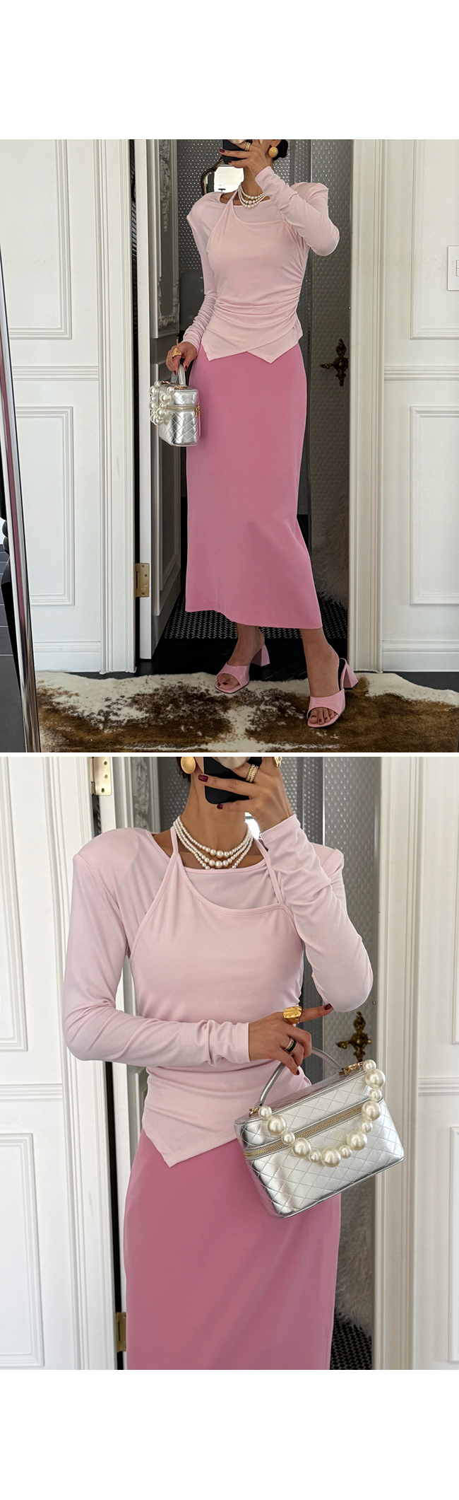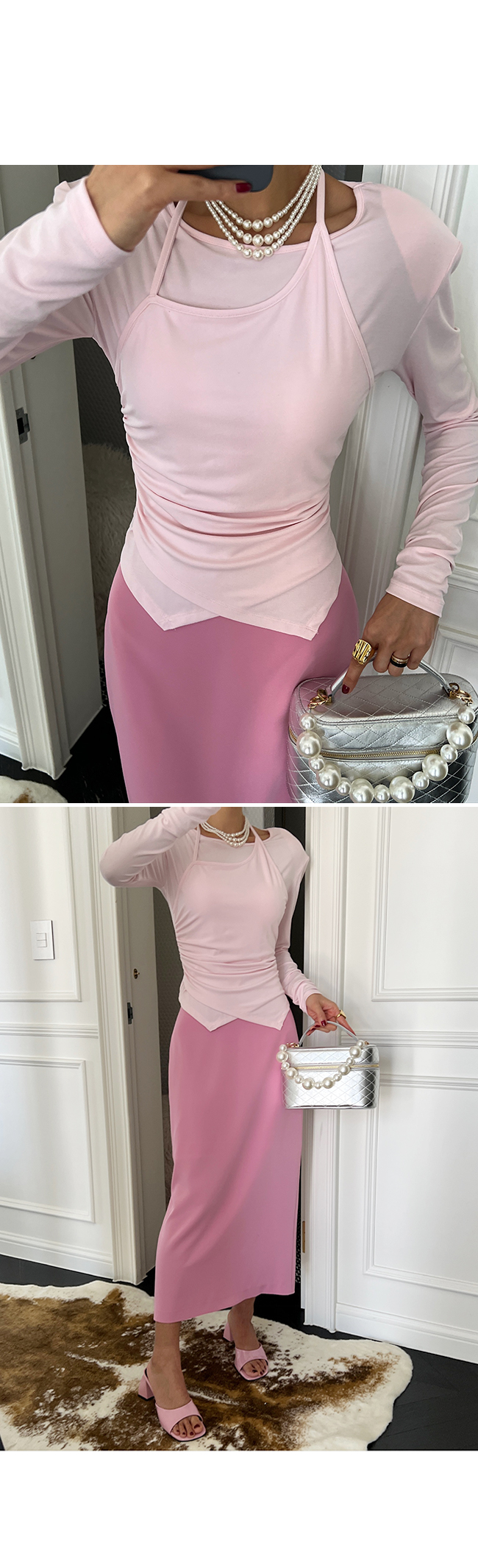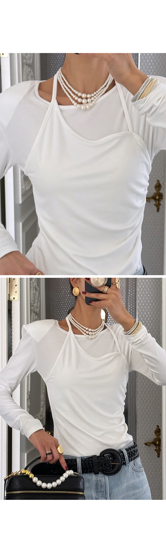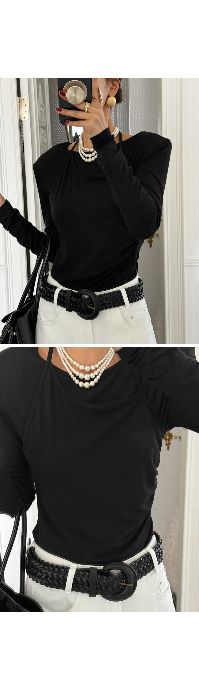 홀터넥 디테일을 더한 레이어드 디자인으로