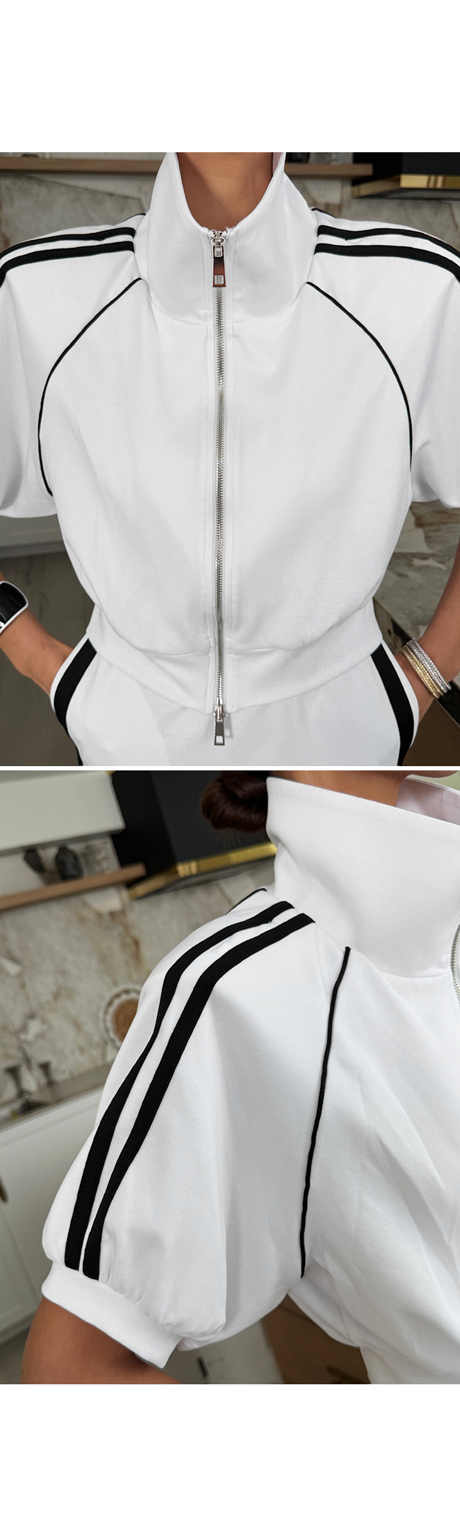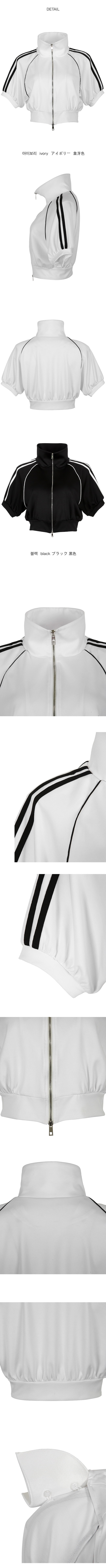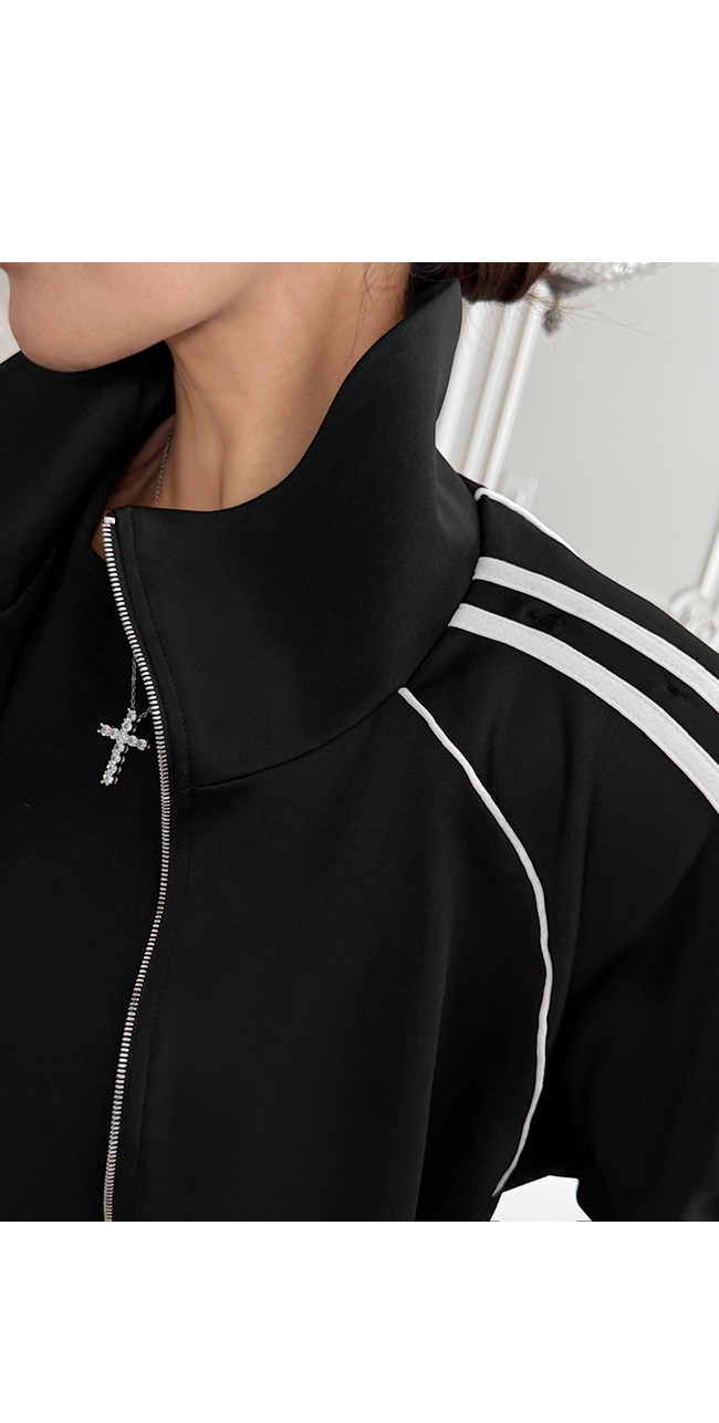 하이넥 집업 디자인으로 넥라인을 안정감 있게 감싸주며